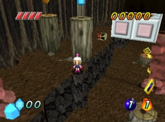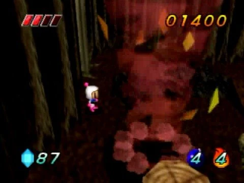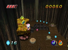 The main objective for White Bomberman is to reach the end of the stage. Tornadoes are introduced in this stage. As Pibot on the walky-talky says, the white tornadoes are harmless while the red ones are harmful. There are also Kirikabu enemies that spray out poison gas to attack. To earn the target score, White Bomberman must collect all of the gems and defeat the Kirikabu monsters. The exit is located on the far left side of the higher area.