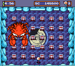 After 6 hits, he will take on his second, smaller form. He moves faster and shoot bubbles in all directions in a square every few seconds. After 5 more hits, he will be defeated. He will harm Bomberman on collision. He takes 6 hits to defeat in his 1st form, and 5 hits in the 2nd form (as a total of 11) and doesn't yield any score points.