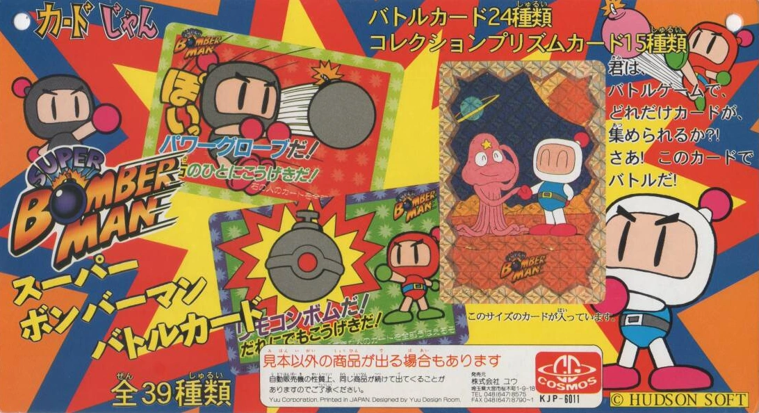 Super Bomberman Battle Cards (スーパーボンバーマン バトルカード) is a series of cards released by Cosmos. It consists of 24 battle cards (with artwork from the Super Bomberman series) and 15 reflective prism cards (with artwork from Super Bomberman - Panic Bomber W.)